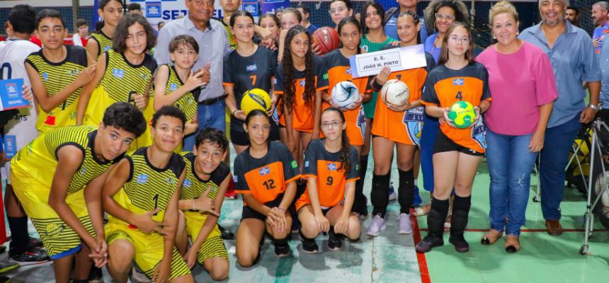 Após a apresentação de cada escola participante, os alunos e diretores de cada instituição receberam das mãos do secretário Rialino e da vereadora Evalda Reis uma bola de cada modalidade coletiva que será disputada nos jogos: futsal, vôlei, basquete e handebol.