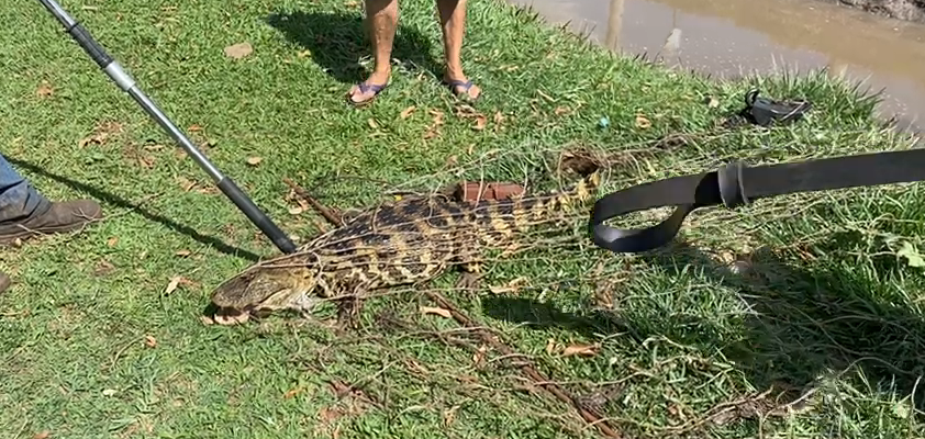 Equipes da Secretaria Municipal do Meio Ambiente de Três Lagoas capturaram um jacaré do papo amarelo que estava em uma das bacias de contenção da Lagoa Maior. O animal mede aproximadamente 1,5 m e pesa 20kg e foi levado para a reserva Particular do Patrimônio Natural Cisalpina, cerca de 75 quilômetros de Três Lagoas.