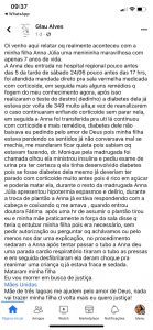 Em um trecho da publicação (confira na íntegra ao final da matéria), Glau relata que foi tratada com descaso pelas pediatras que atenderam a filha e que uma das médicas chegou a dizer que, se a criança estava com diabetes, não poderia ser medicada com corticoide, pois o medicamento poderia matar a criança, por te alto teor de açúcar.